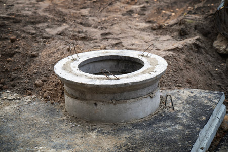 Installation of a reinforced concrete well for water supply and sewerage at the construction site. Well rings with cast iron hatch and construction tool