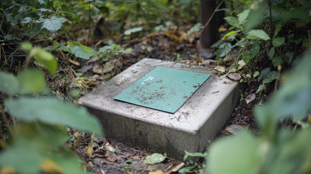 A green cover rests atop a concrete base among robust foliage, illustrating how nature can reclaim urban environments and create serene pockets of beauty.