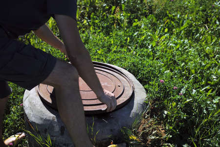 The worker opened the well hatch and looks inside. Troubleshooting, checking septic tanks.
