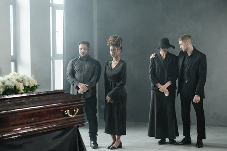 Group of young adult and middle aged people including Black woman and Caucasian men standing beside coffin during funeral ceremony, one man comforting grieving Caucasian woman