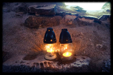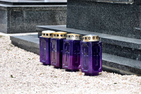 burning candles in colorful lanterns on the grave, candle background