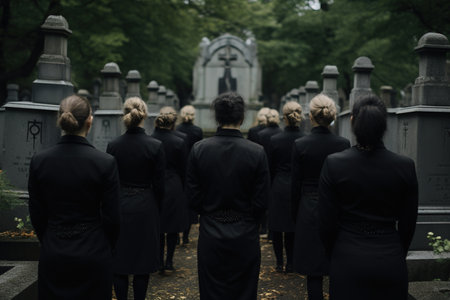 Group of witches or goths in black clothes at cemetary. Generative AI.