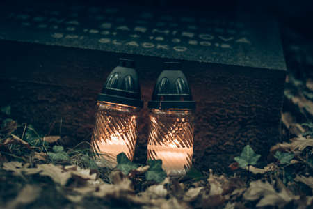 Woman is putting candle lantern at grave in cemetery. Grief and paying respect for dead person