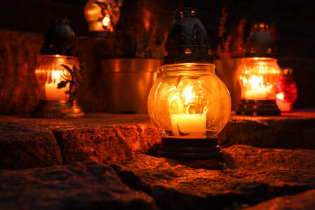 Different grave lanterns with burning candles on stone surface at night