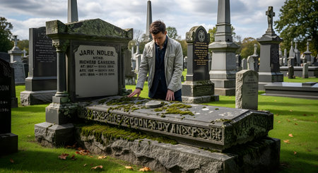 A man stands in a historic cemetery, gently touching a large, moss-covered gravestone in a moment of quiet reflection. The scene evokes feelings of remembrance, grief, history, and connecting with one's ancestry.