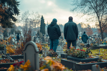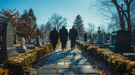 Two men are seen walking down a path in a cemetery, surrounded by tombstones and trees on either side. AI Generative