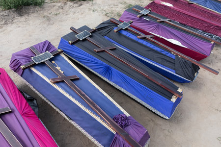 many black coffins with crosses above view. 3d rendering