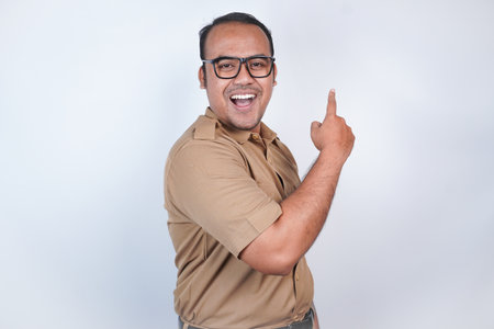 a man Asian civil servants or state civil servants is with brown uniform gesturing pointing at the copy space on beside him On white background. Indonesia PNS, ASN