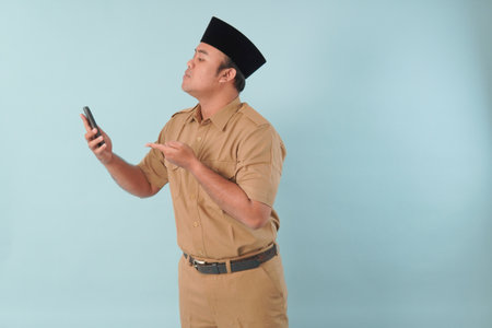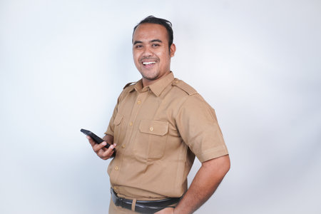 a man smiling Asian civil servants or state civil servants is with brown uniform gesture showing his phone . On white background. Indonesia PNS, ASN