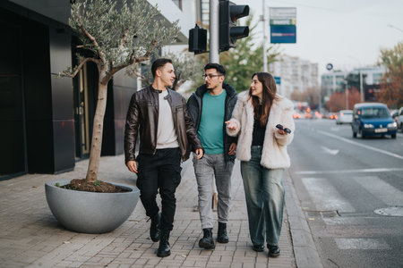 Group of business entrepreneurs walking outdoors in a vibrant urban setting