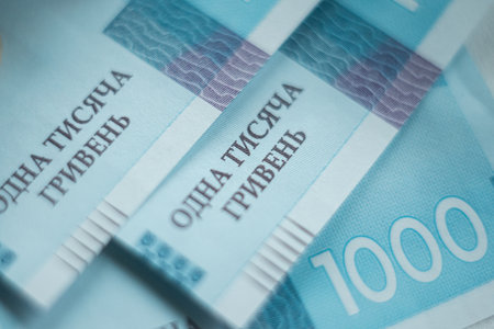 Kyiv, Ukraine - November 2019: close-up macro detail of one thousand hryvnia Ukrainian paper banknote