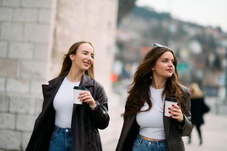 Young girls holding cups of coffee having a chat while walking on the streets of downtown Bucharest, Romania, 2019