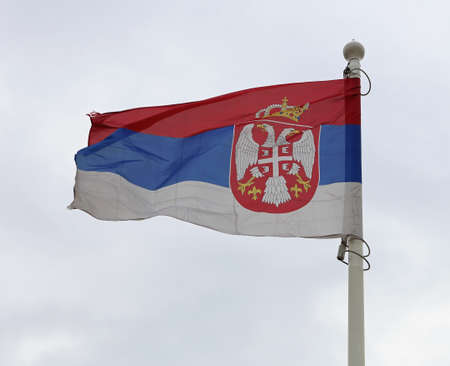 The flag of serbia against the blue sky flutters in the wind. Flag of a country in Europe..