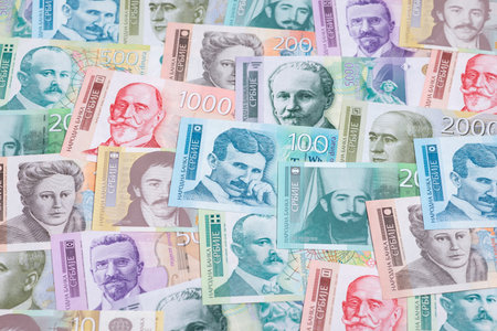 A heap of Serbian dinar paper currency. Serbian money as backgrounds. Selective focus.