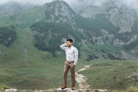 Portrait of a handsome young Kazakh man on a background of mountains.