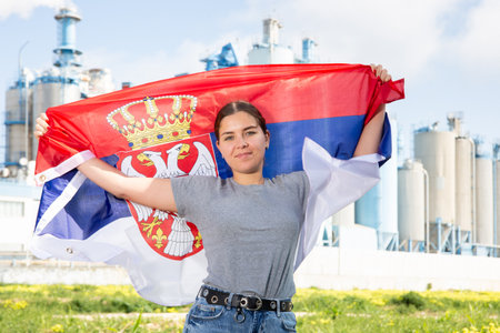 Young female in casual wear waving state flag of Serbia while standing in front of big tanks at chemical plant