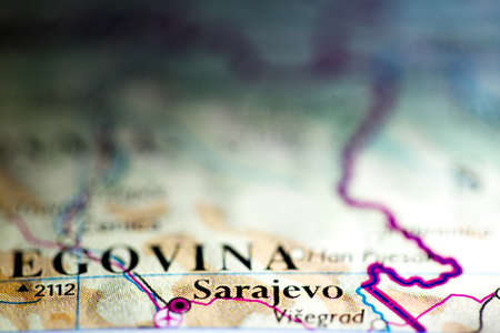 Shallow depth of field focus on geographical map location of Sarajevo city Bosnia and Herzegovina Europe continent on atlas