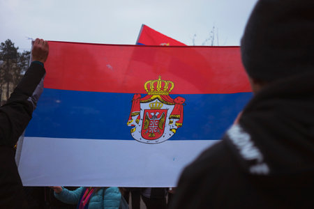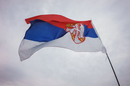Serbian flag on a stick, fluttering in the wind, cloudy sky in the background.