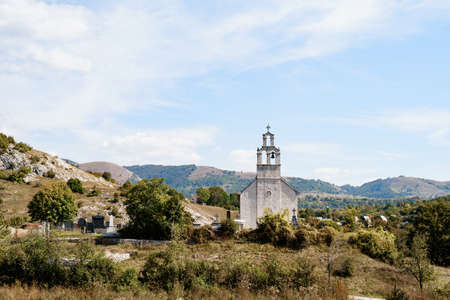 Old chapel with a bell tower near the cemetery in the field against the background of mountains