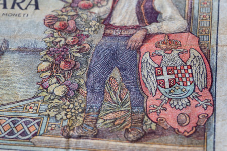 Detail from banknote from Kingdom of Yugoslavia, coat of arms on reverse and man in traditional folk costume with opanak or peasant shoes