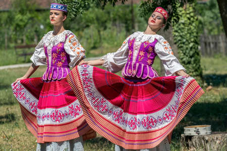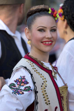 Young girls from Serbia, in traditional specific costumes, attended at a international folk dance festival