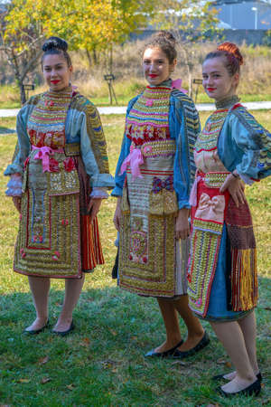 TIMISOARA, ROMANIA - OCTOBER 13, 2018: Dancer girls from Bulgaria in traditional costume present at the autumn folk festival ,,Harvest products