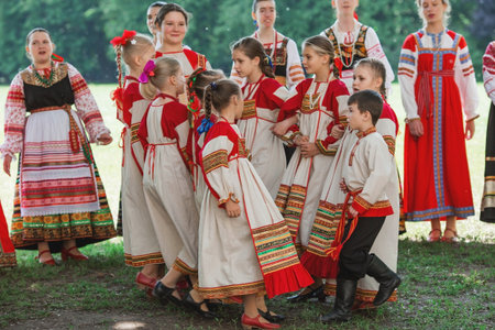 Russian folk traditions. folk festivals. Children in beautiful Russian traditional outfits sing songs, dance and lead a round dance in Tsaritsyno Park. National Russian clothing. Sundresses and kokoshniks.