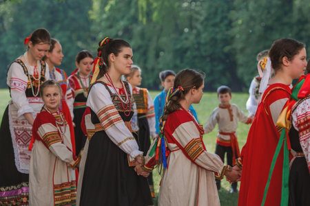 Varvara, Bulgaria - May 5, 2015: People in traditional costumes dance bulgarian horo a meadow near the village of Varvara