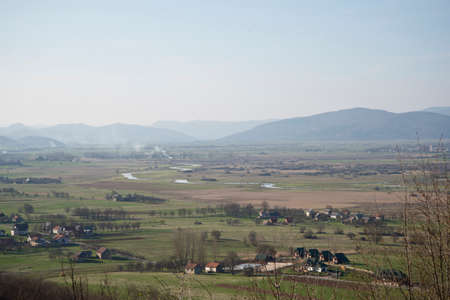 Rocky outcrop above Rovni Lake overlooking villages, forest, and fields in the Valjevo region of Serbia