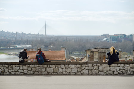 Belgrade, Serbia - March 7, 2023: Young people relax and have lunch on the observation deck of Kalemegdan Park nearby the Belgrade Fortress. Local and tourists admiring view of Sava river and city