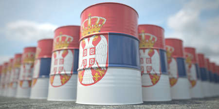 Many barrels with flag of Serbia. Oil or chemical industry supply related 3D rendering