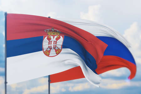 Waving Russian flag and flag of Serbia. Closeup view, 3D illustration.