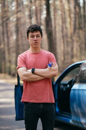 A young white guy or man in casual wear is enjoying the beauty of nature while being out of town, life style.