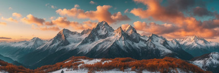 Stunning mountain range illuminated by early morning light, showcasing tall, snow-draped peaks and serene valleys. The colors create a picturesque atmosphere in nature's beauty.