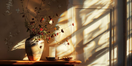 Sunlit still life with a rustic vase and wildflowers casting delicate shadows, capturing the essence of serene elegance. Perfect for those who appreciate nature quiet beauty. Generated A.I.