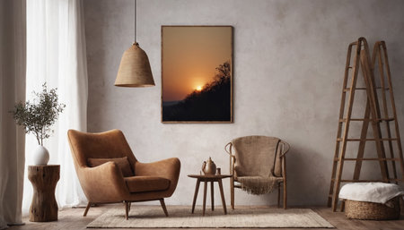 Interior design of living room with brown armchair, coffee table, plant and picture frame on wall