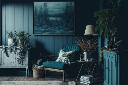 Interior of living room with blue sofa, coffee cup, plants and picture frames on gray wall. 3d render