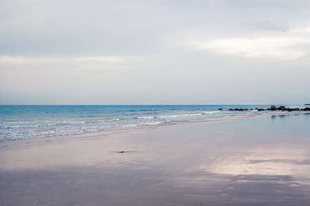 the wave in the beach before sunrise and the vanilla clearly sky, the landscape photo of the beautiful lonely beach on the dawn with no people and cloud.