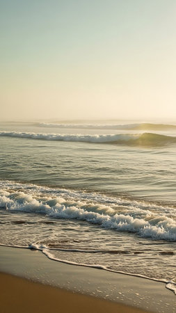 A picturesque beach scene featuring soft sand, gentle waves, and a misty atmosphere. The tranquil environment offers a serene escape into nature's beauty.