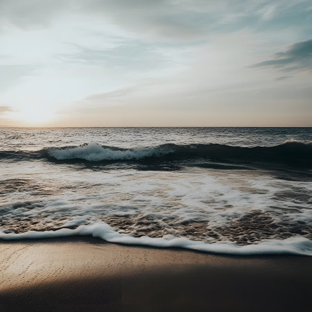 Experience the calm beauty of ocean waves rolling onto a sandy beach at sunrise, creating a serene and tranquil atmosphere in this picturesque coastal landscape.