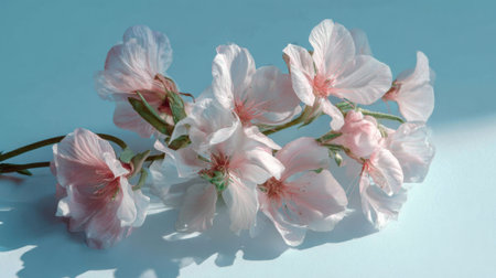 Cherry blossoms rest on a soft blue surface, emphasizing their elegant pink and white petals. Sunlight gently highlights their beauty, creating a serene atmosphere.