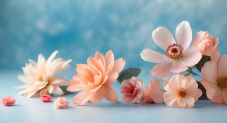 Pink flowers blooming against a pastel blue sky creating a beautiful and romantic atmosphere, perfect for valentines day, mothers day, or spring celebrations