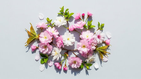 An overhead view of a delicate arrangement of pink and white cherry blossom flowers and green leaves on a light grey background with scattered petals.