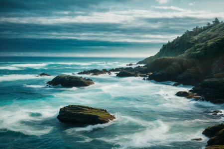 Experience the tranquil beauty of ocean waves gently crashing on a rocky shore, framed by lush forests and dramatic skies in a peaceful coastal setting.