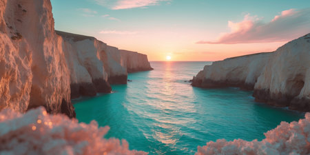 AI Generated. Vibrant Sunset Over a Turquoise Sea Through Coastal Cliffs