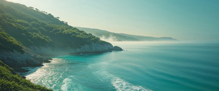AI Generated. Panoramic View of Turquoise Sea Bay with Rocky Coastline and Lush Green Vegetation