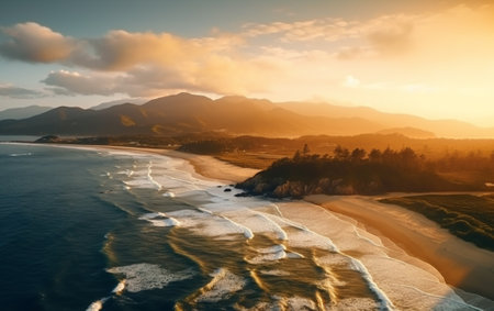 a mesmerizing aerial view of a sandy beach nestled amidst the lush greenery of a temperate rainforest. warm color grading evokes the vibrant hues of the tropical landscape, capturing the breathtaking beauty of this unique ecosystem from a breathtaking height. ai generated