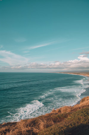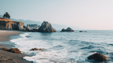 A serene view of the Pacific coastline with cliffs and crashing waves. No people, copy space.