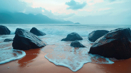 A serene beach scene at dawn with gentle waves lapping against large rocks. The overcast sky adds a dreamy atmosphere, perfect for relaxation and nature appreciation.