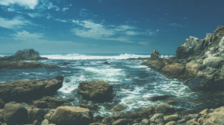 Explore a breathtaking coastal scene featuring gentle waves crashing against rugged rocks, under a clear blue sky that embodies tranquility and natural beauty.
